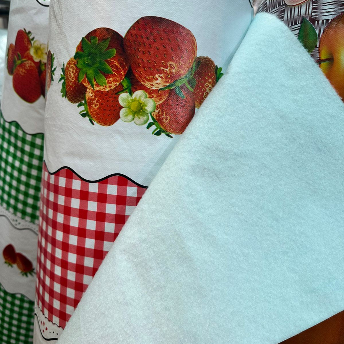 Una capa de tela afranelada, o de felpa, que se une a las capas plásticas para dar mayor agarre al mantel o cubierta, y también resistencia y una textura suave.
